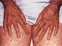 - Áreas expuestas al sol como la cara muestran un enrojecimiento de la piel con descamación y pecas. Irregulares manchas oscuras también pueden comenzar a aparecer.
